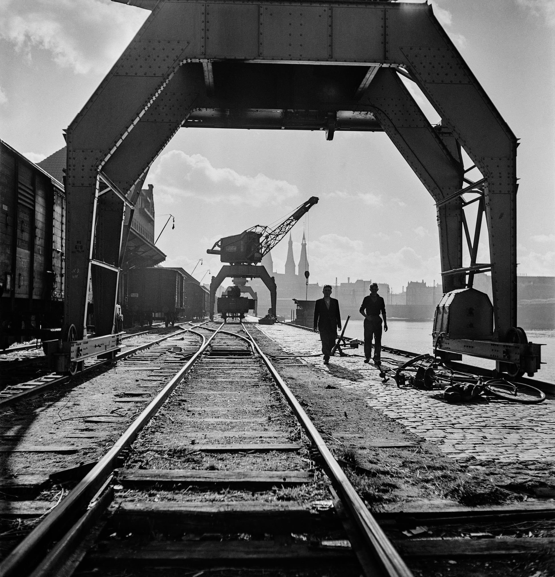 Title: Kranen aan de achterzijde van douaneloodsen langs het Westerdok en op de achtergrond de r.k. Posthoornkerk (1935-1940)