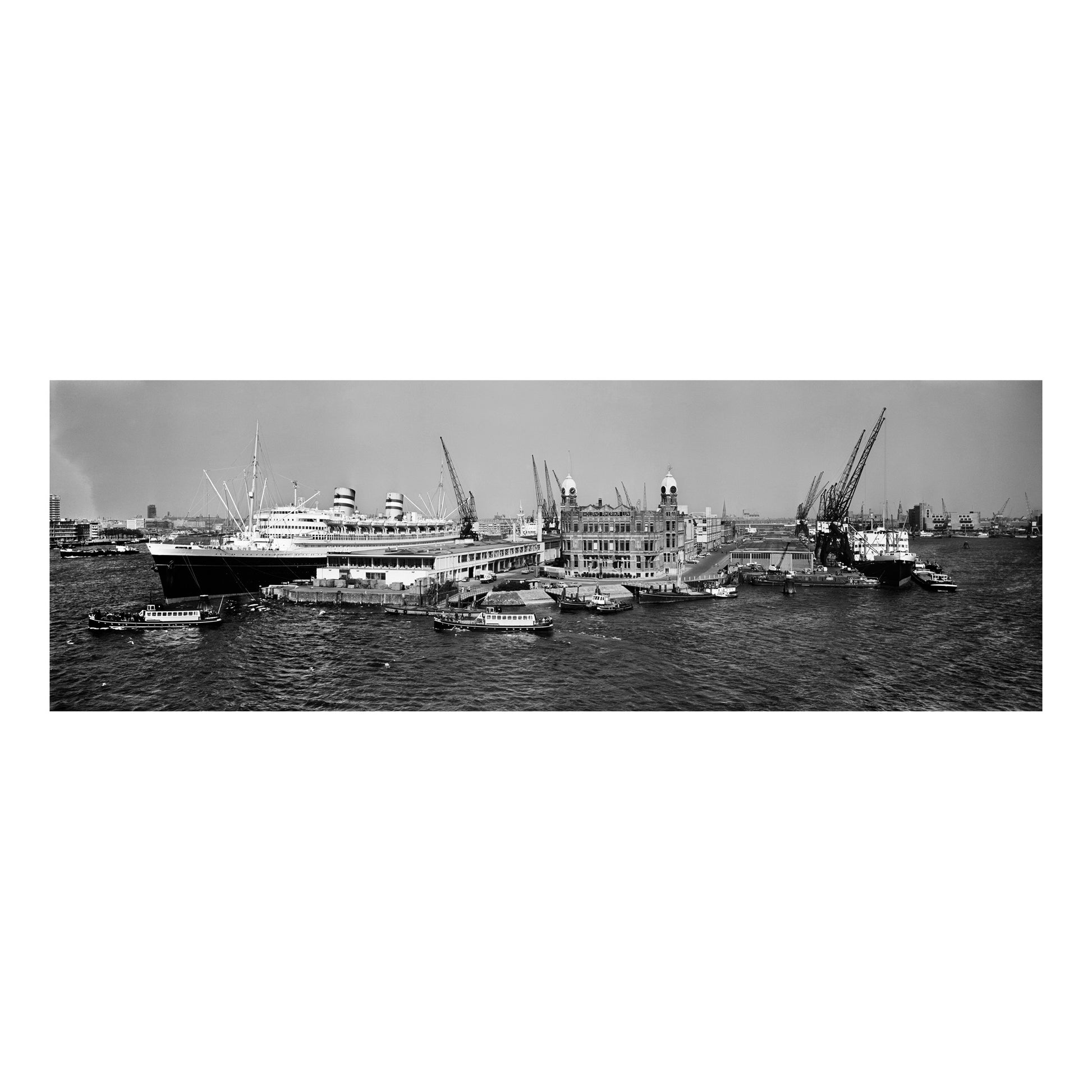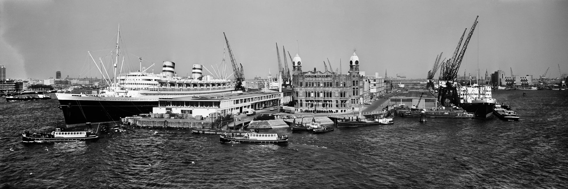 Titel: Wilhelminapier met het stoomschip Nieuw Amsterdam van de Holland Amerika Lijn, Rotterdam (1956)